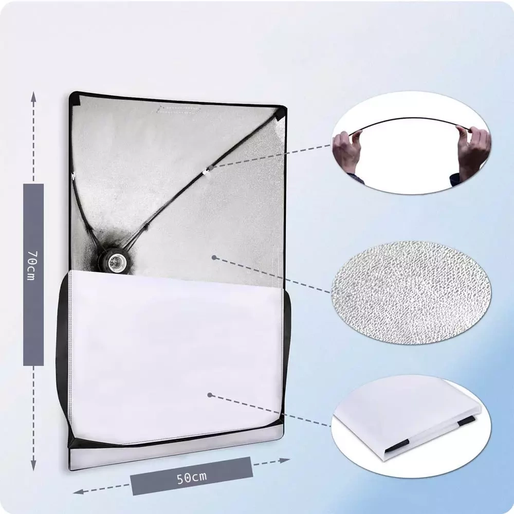 ✔️ Zestaw softbox zapewnia plastyczne i miękkie oświetlenie. Posiada nakładany dyfuzor rozpraszający światło a jego wnętrze jest dodatkowo pokryte odbijającym światło materiałem.