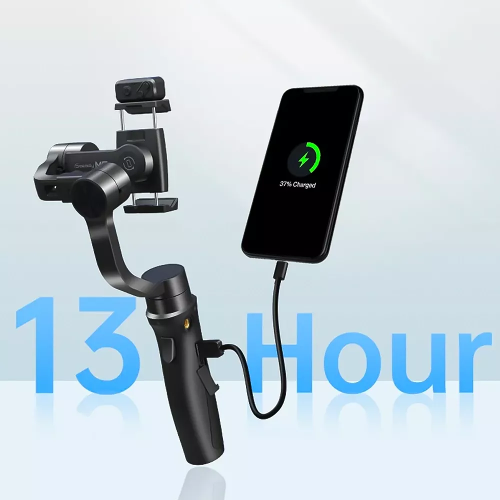 Ten gimbal jest również wyposażony w wytrzymałą baterię o pojemności 1800 mAh, która zapewnia do 13 godzin pracy na jednym ładowaniu. Możesz bez obaw rejestrować długie filmy, nie martwiąc się o nagły brak energii. W przypadku rozładowania baterii możesz ją naładować poprzez port USB-C. Nawet jeśli Twój smartfon się rozładuje, nie oznacza to końca nagrywania, gdyż gimbal może pełnić funkcję powerbanku.