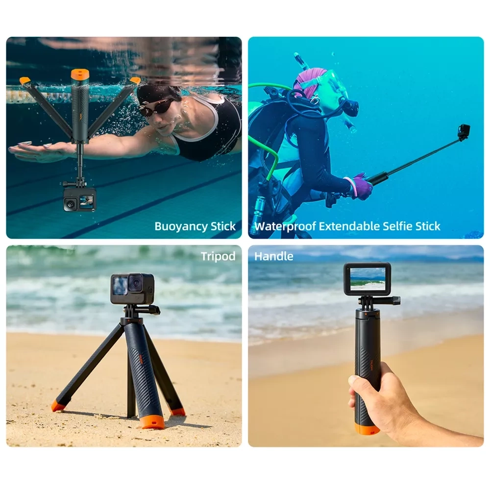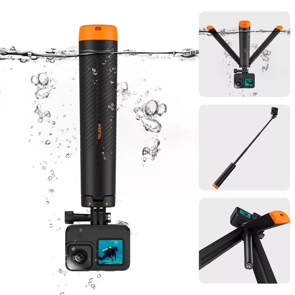✔️ TELESIN Floating Tripod Selfie Stick łączy w sobie cztery narzędzia, których potrzebujesz podczas każdej przygody. Funkcja pływającego statywu zabezpiecza Twoją kamerę w wodzie, zapewniając stabilność ujęć. Wodoodporny kijek selfie sprawdzi się zarówno nad, jak i pod wodą. Możesz także użyć go jako statywu do filmowania z lądu, lub po prostu jako uchwytu, kiedy chcesz zrobić szybkie zdjęcie w biegu.