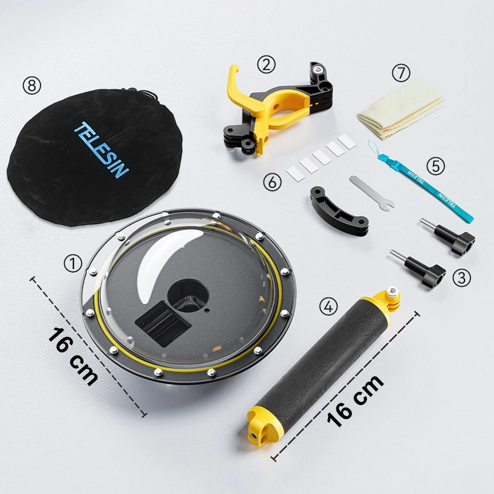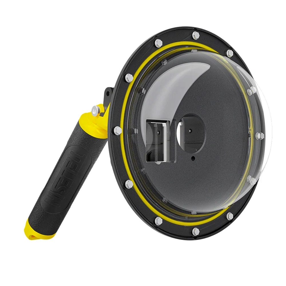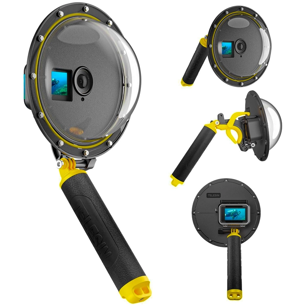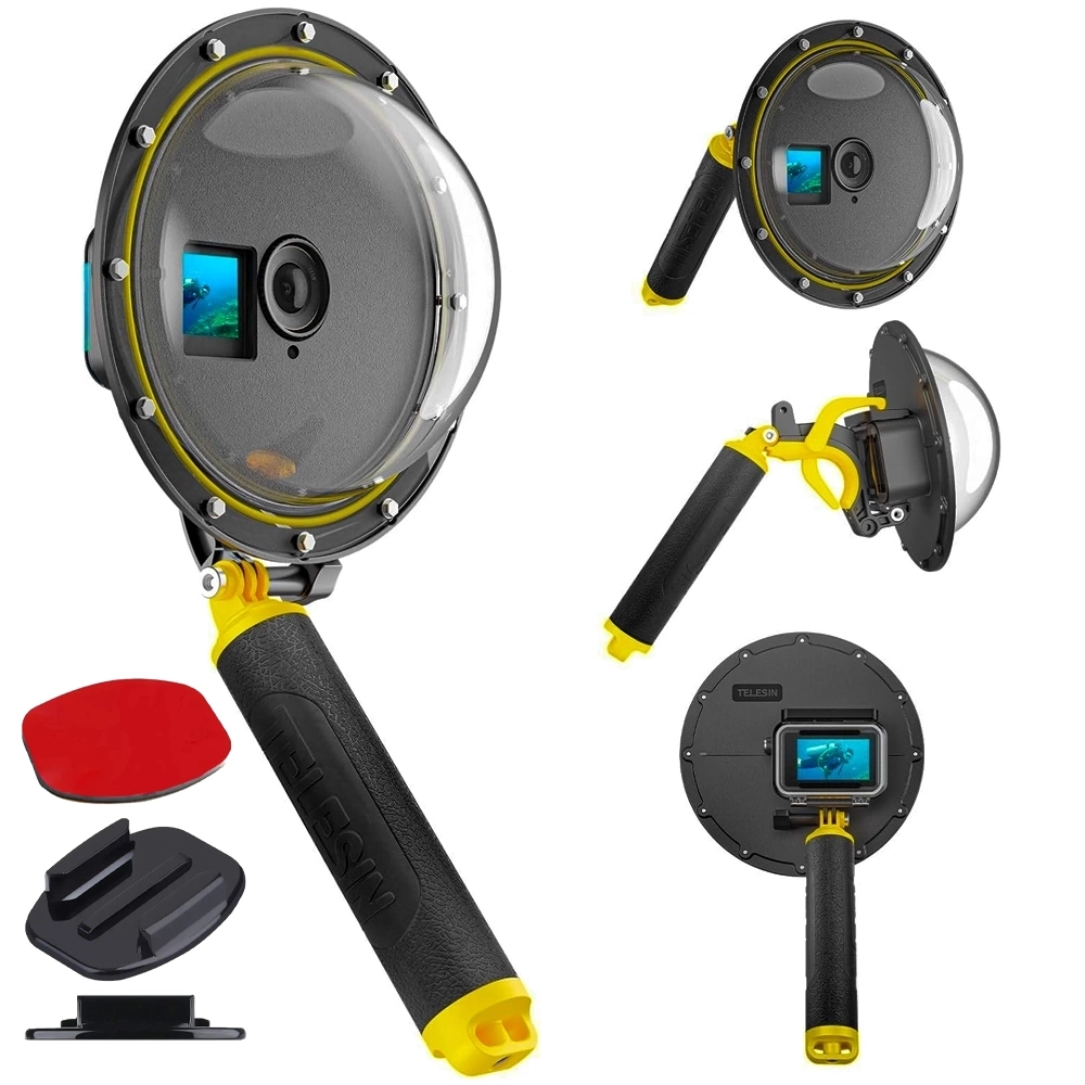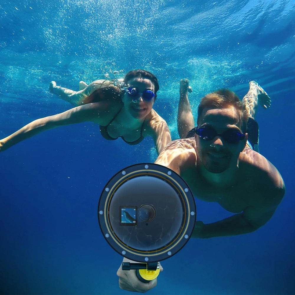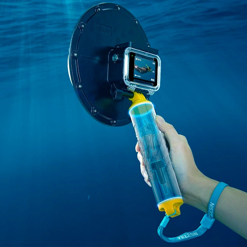 ✔️ Wygodny uchwyt wypornościowy zapewnia łatwe operowanie kamerą pod wodą i na powierzchni. Zapobiega zatonięciu kamery – nawet jeśli upuścisz ją w wodzie, unosi się na powierzchni. Można go użyć z kopułą lub osobno. Gwint 1/4" na spodzie umożliwia montaż na statywie, a szczelny schowek w rączce chroni drobne akcesoria.